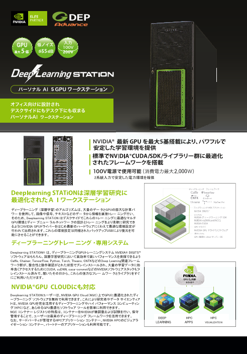 DeepLearning BOX® は NVIDIA エリートパートナーである(株)GDEPアドバンスが日本版DevBox®として開発した、日本初のGPUディープラーニングワークステーションです。「NVIDIA® DIGITS™ソフトウェア」はもちろん、...
