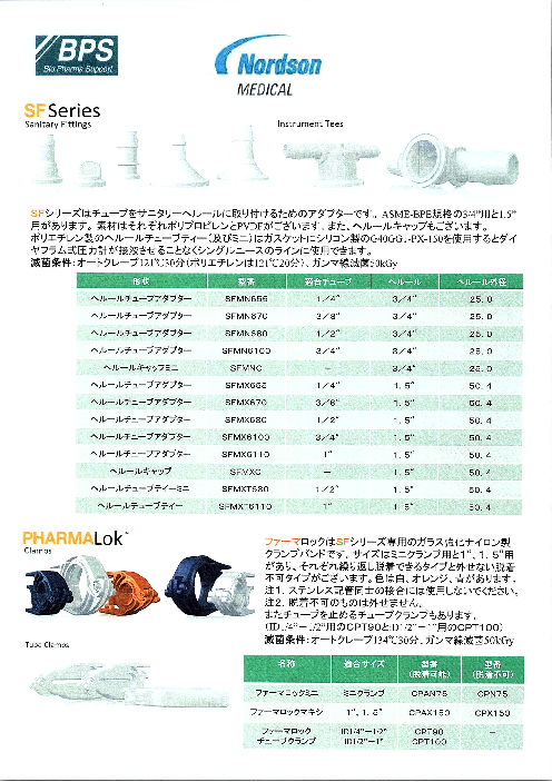■SF Series SFシリーズはチューブをサニタリーヘルールに取り付けるためのアダプターです。 ASME-BPE規格の3/4"用と1.5"用があります。 素材はそれぞれポリプロピレンとPVDFがございます。 また、ヘルールキャップもございます...