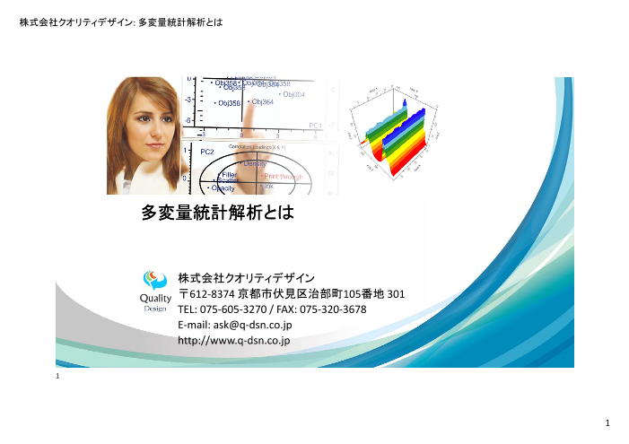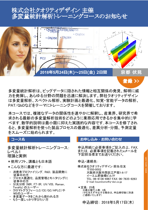 多変量統計解析は、ビッグデータに隠された情報と相互関係の発見、解明に威 力を発揮し、あらゆる分野の問題を迅速に解決します。 弊社クオリティデザイン は多変量解析、スペクトル解析、実験計画と最適化、知覚・官能データの解析、 PAT/QbDな...
