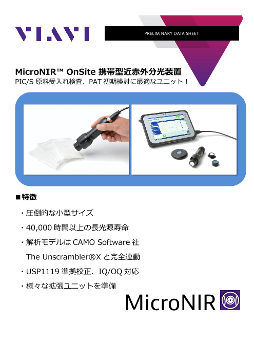 ■特徴 ・圧倒的な小型サイズ ・40,000時間以上の⻑光源寿命 ・解析モデルはCAMO Software社 The Unscrambler®Xと完全連動 ・USP1119準拠校正、IQ/OQ対応 ・様々な拡張ユニットを準備 ◆詳細はカ...