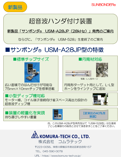 2024年11月1日より新製品「サンボンダ USM-A28JP」発売を開始します。 スパッタターゲット材等の大きな面積のハンダ付けに最適な商品です。 ラインナップにL-L型ホーンを追加。円筒型ターゲットにも対応可能です。 発売に合わせ、サンボン...