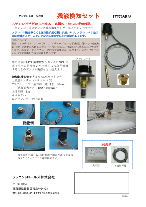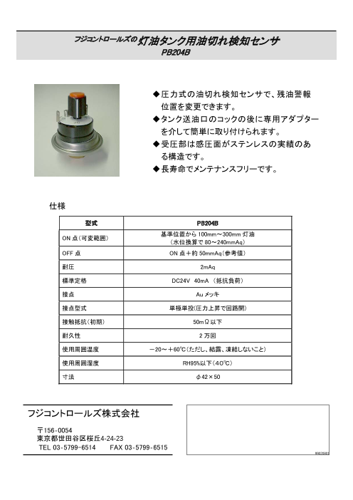本製品は灯油のヘッド圧を検知して動作する圧力式灯油センサで、灯油タンクの残量が少なくなった場合にONします。ONする際の残油量は、灯油センサの調整ツマミで設定します。 ◆詳細はカタログをダウンロードしてご覧下さい。