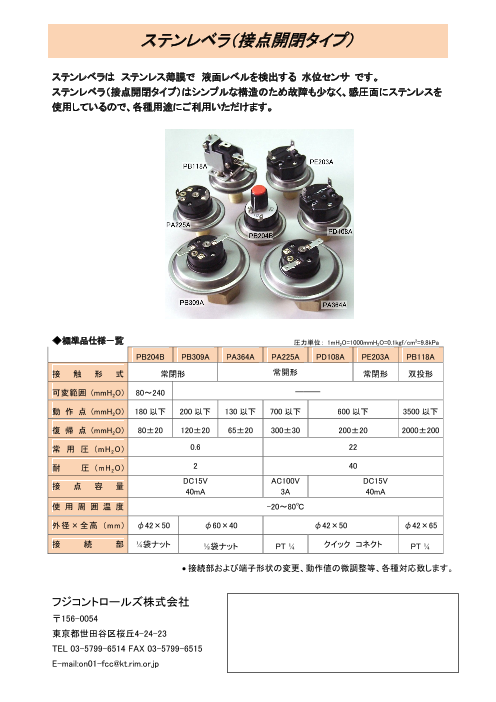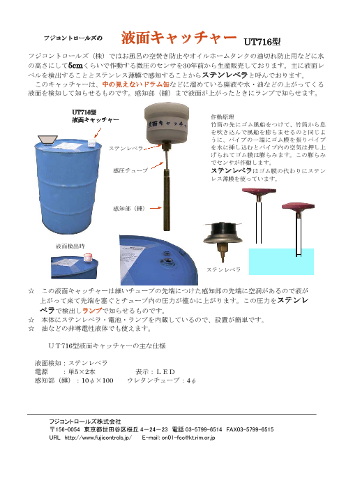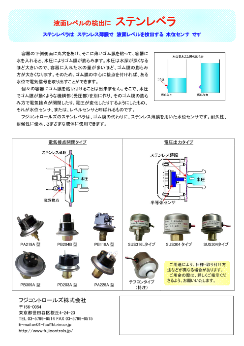 フジコントロールズ(株)ではお風呂の空焚き防止やオイルホームタンクの油切れ防止用などに水の高さにして5cmくらいで作動する微圧のセンサを30年前から生産販売しております。主に液面レベルを検出することとステンレス薄膜で感知することからステンレベラと呼んでお...