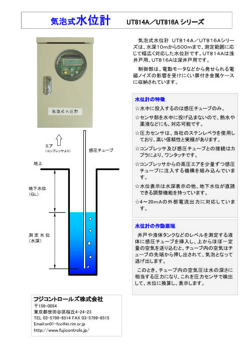 UT814Aは浅井戸用、UT816Aは深井戸用です。 制御部は、電動モータなどから発せられる電磁ノイズの影響を受けにくい扉付き金属ケースに収納されています。 ◆水中に投入するのは感圧チューブのみ。 ◆センサ部を水中に投げ込まないのて...
