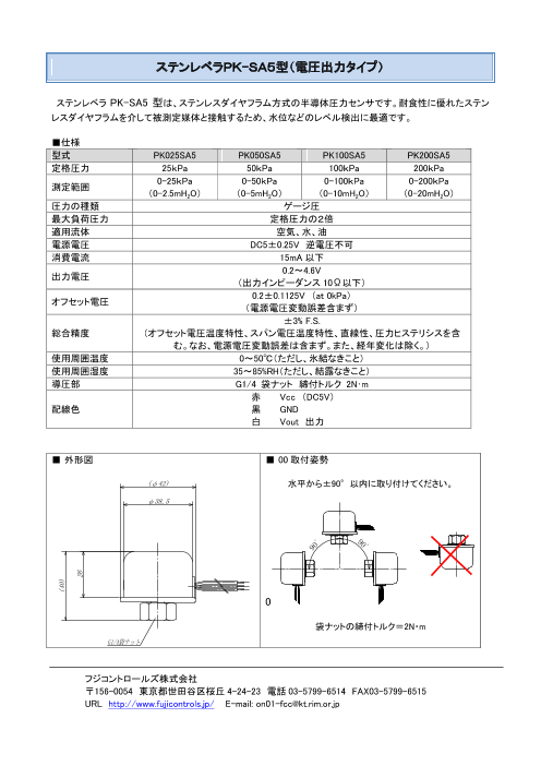 ステンレベラ PK-SA5型は、ステンレスダイヤフラム方式の半導体圧力センサです。耐食性に優れたステンレスダイヤフラムを介して被測定媒体と接触するため、水位などのレベル検出に最適です。 ◆詳細はカタログをダウンロードしてご覧下さい。