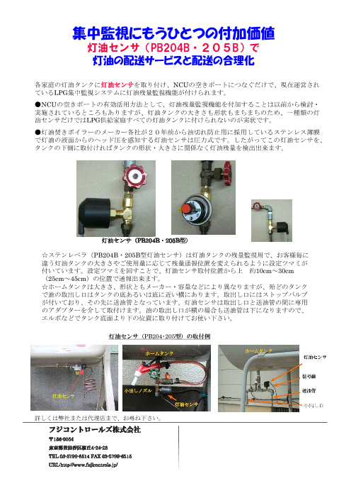 各家庭の灯油タンクに灯油センサを取り付け、NCUの空きポートにつなぐだけで、現在運営され ているLPG集中監視システムに灯油残量監視機能が付けられます。 ●NCUの空きポートの有効活用方法として、灯油残量監視機能を付加することは以前から...