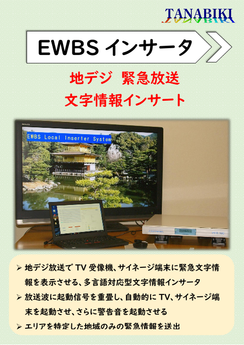 EWBS(緊急放送)の放送電波受信モジュール及び受信モジュール内蔵表示器で、TV無しで緊急文字情報を表示する。 ◆詳細はカタログをダウンロードしてご覧下さい。