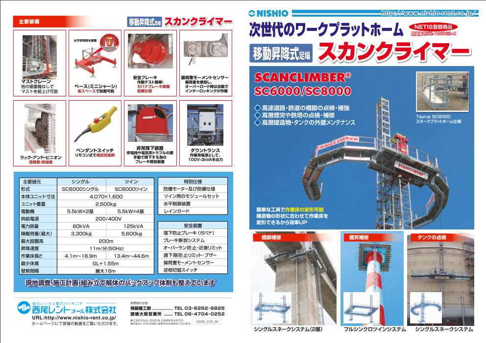 作業床が変形できるから効率的!次世代ワークプラットフォーム! 画期的な機能と安全性能を持つ 新しい移動昇降式足場『スカンクライマーSC6000』 [フルシンクロシステム] ・2基同時に昇降可能! →建造物を挟んでデッキ設置が可能 ・各種安全...
