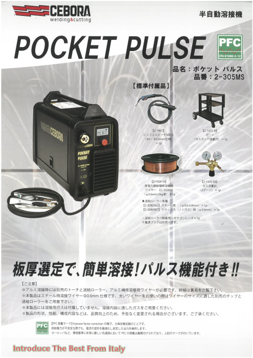 様々な熔接に対応する時代に先駆けた性能と卓越した操作性で、自動車の本場欧州をはじめとする世界のトップメーカーから認証を受けているCEBORA社製の半自動溶接機 POCKET PULSE(ポケットパルス)を是非お試しください。