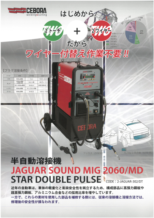 様々な熔接に対応する時代に先駆けた性能と卓越した操作性で、自動車の本場欧州をはじめとする世界のトップメーカーから認証を受けているCEBORA社製の半自動溶接機 JAGUAR SOUND MIG 2060/MD(ジャガーサウンドミグ)を是非お試しください。