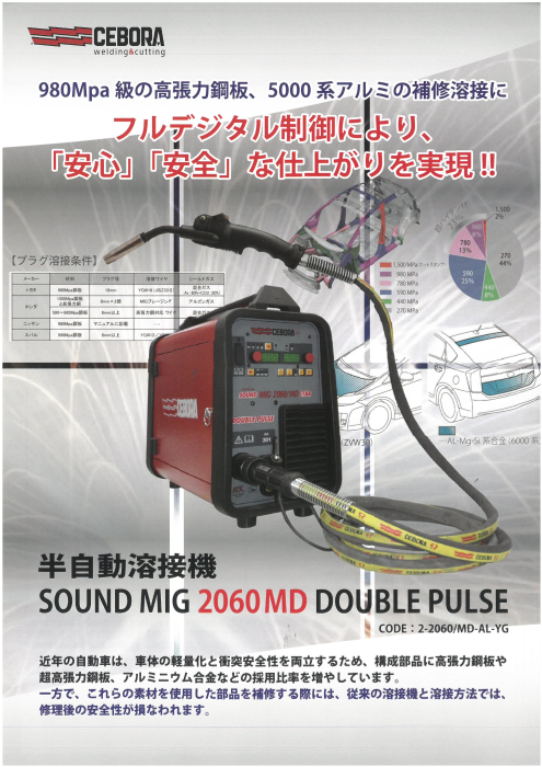 様々な熔接に対応する時代に先駆けた性能と卓越した操作性で、自動車の本場欧州をはじめとする世界のトップメーカーから認証を受けているCEBORA社製の半自動溶接機 SOUND MIG 2060/MD(サウンドミグ)を是非お試しください。