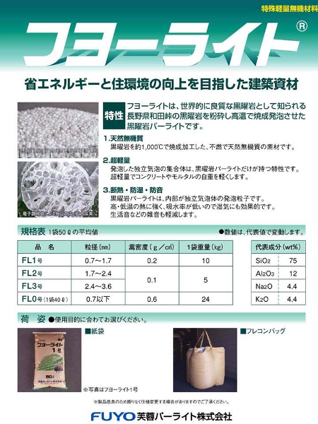 フヨーライトは、世界的に良質は黒曜岩として知られる長野県和田峠の黒曜岩を粉砕し高温で焼成発砲させた黒曜岩ライトです。 【特性】 ◆天然無機質 ◆超軽量 ◆断熱・防湿・防音 ◆詳細はカタログをダウンロードしてご覧下さい。