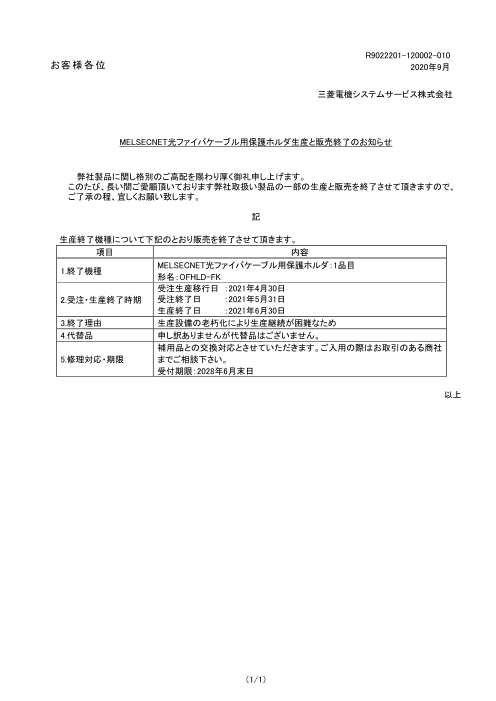 MELSECNET光ファイバーケーブル用保護ホルダ 生産中止
