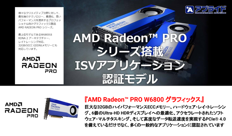 AMD Radeon Proシリーズの中でもハイエンドの「AMD Radeon™ PRO W6800 グラフィックス」を搭載したアプライドのオリジナルデスクトップPCをご紹介。 AMD Radeon™ PRO W6800 ISV認定のソフトウェアが1,...