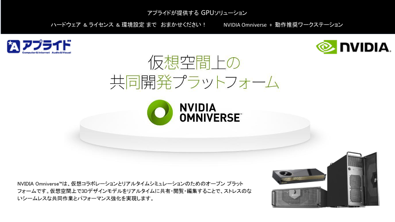 アプライドが提供する GPUソリューション ハードウェア & ライセンス & 環境設定 まで おまかせください! NVIDIA Omniverse + 動作推奨ワークステーション NVIDIA Omniverse 導入をご検討の方は...