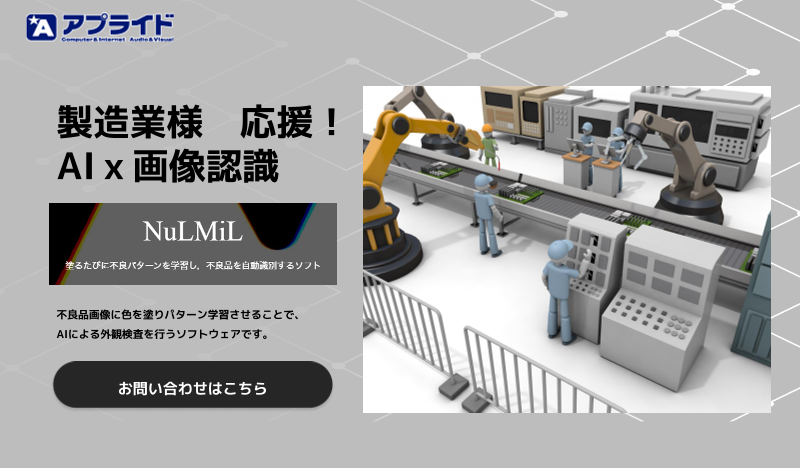 次世代マシンビジョン ~AIで外観検査の常識を変える~ 外観検査は導入と運用のしやすさの時代に! AI外観検査ソリューションはアプライドにおまかせください。 AI外観検査導入可否の判定のために 無償PoCをご希望のお客様は お問い合わせ...