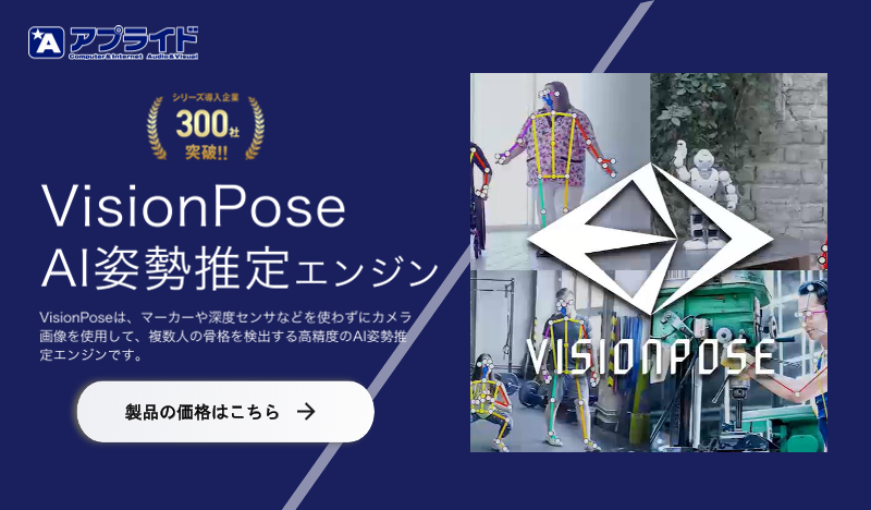 ご提案サイトは、こちら https://visionpose.sfsite.me/ シリーズ導入企業 300社突破 VisionPoseは、マーカーや深度センサなどを使わずにカメラ画像を使用して、 複数人の骨格を検出する高精度のAI姿勢推定...