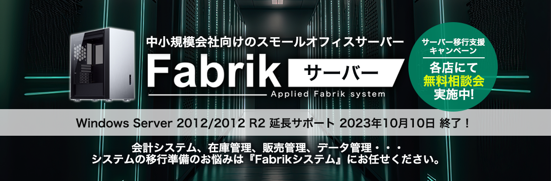 導入機器からサポートまでトータルでご提案いたします! Fabrik サーバー ラインナップ一覧 Windows Server 2012/2012 R2 延長サポートは、2023年10月10日 に終了します。 システム移行準備はお任せください。