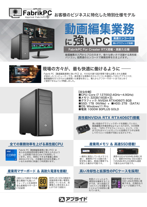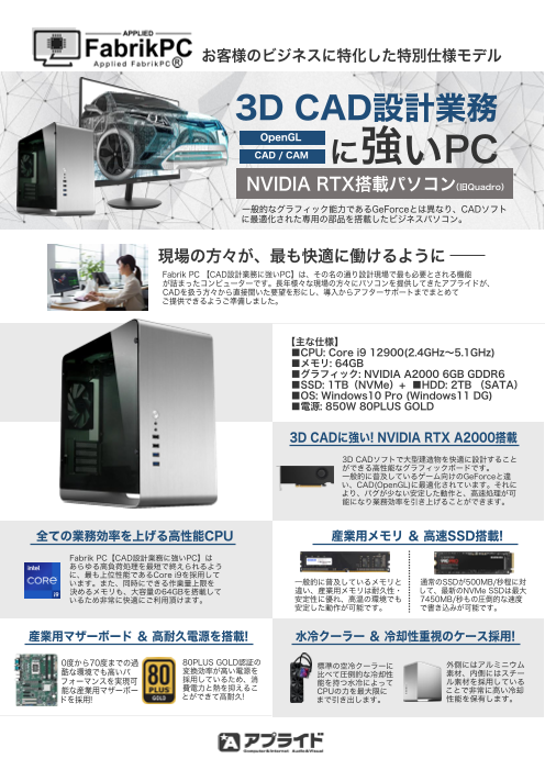 業務スピードを劇的に変えるPC 処理の速さを徹底追及した特別仕様 仕事効率化、ストレスフリー、時短を実現! 「業務の効率化」を行うにあたって最も効果的な高性能PCの導入 アプライドではPCの処理速度に徹底的にこだわったPCをご用意しております...