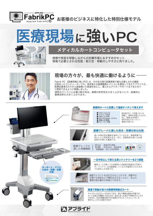 アプライドのPCは厚生労働省の「オンライン資格確認端末」の要件を満たした仕様のPCを導入いただけます。 オンライン資格確認端末対応アプライドBTOパソコンのご紹介。24時間稼働を前提とした、医療機関向け Windows10IoT搭載モデル、医療現場に応...