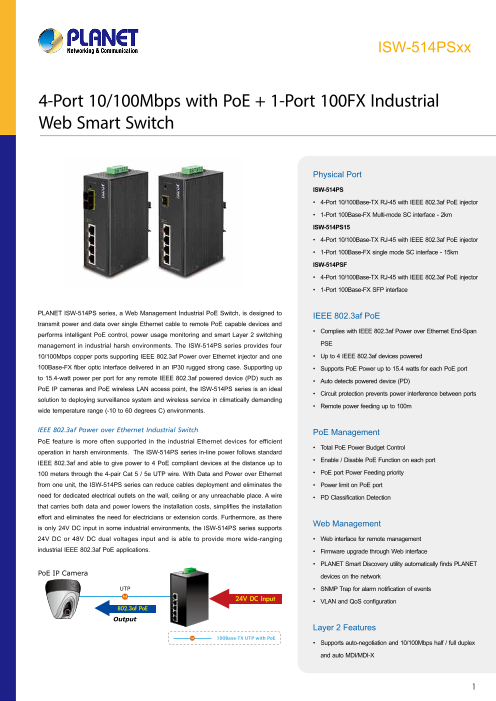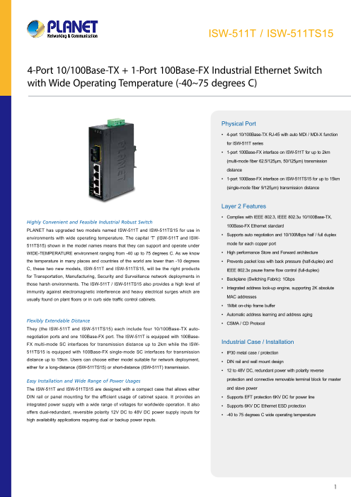4ポート10/100Base-TX+1ポート100Base-FX,-40-75℃...