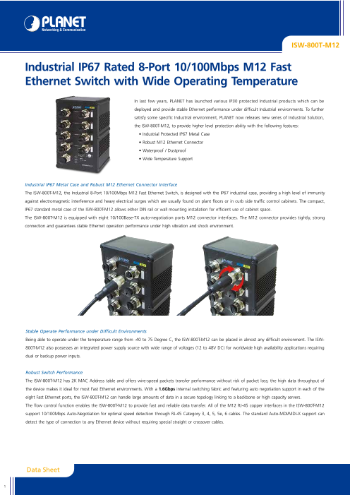 工業用 IP67規格 8ポート10/100, M12コネクタ, -40-75℃