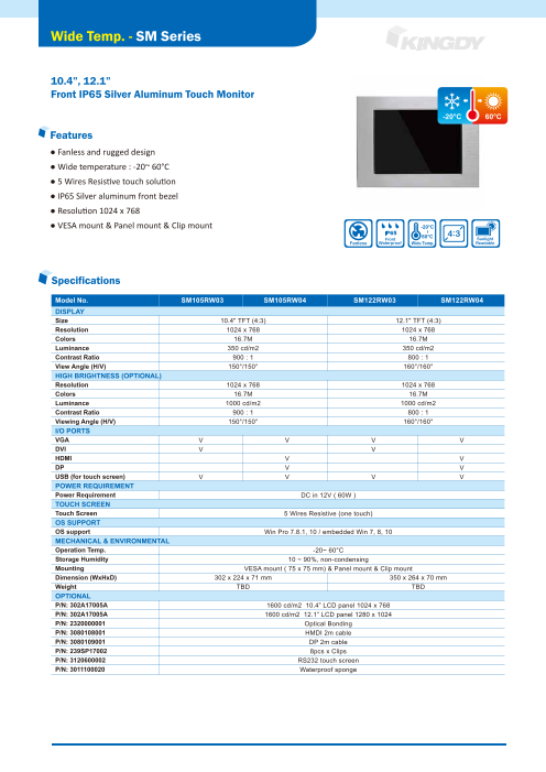 <特長> ・10.4インチTFT (4:3) ・拡張温度対応(-20~60℃) ・フラットベゼル デザイン ・IP65 前面防塵防水 ・筐体:アルミ ・解像度:1024 x 768 ・輝度:350 cd/m2 ・視野角(H/V) :150...