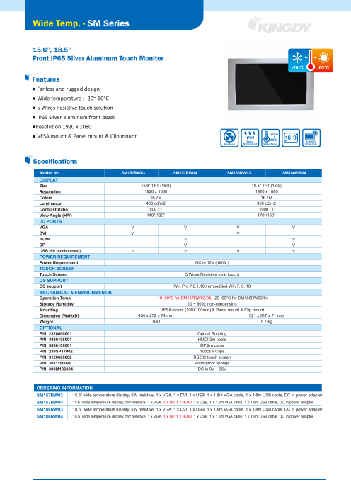 <特長> ・15.6インチTFT (4:3) ・拡張温度対応(-10~60℃) ・IP65 前面防塵防水 ・筐体:アルミ ・解像度:1920 x 1080 ・輝度:400 cd/m2 ・視野角(H/V) :140°/120° ・タッチパネ...