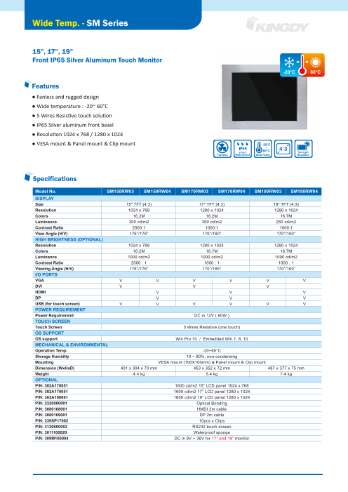 <特長> ・15インチTFT (4:3) ・拡張温度対応(-20~60℃) ・フラットベゼル デザイン ・IP65 前面防塵防水 ・筐体:アルミ ・解像度:1024 x 768 ・輝度:300 cd/m2 ・視野角(H/V) :176/1...