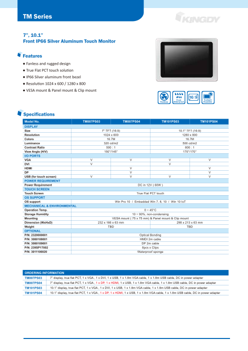 <特長> ・7インチTFT (16:9) ・フラットベゼル デザイン ・IP66 前面防塵防水 ・筐体:アルミ ・解像度:1024 x 600 ・輝度:320 cd/m2 ・視野角(H/V) :150/145 ・タッチパネル:投影静電式 ...