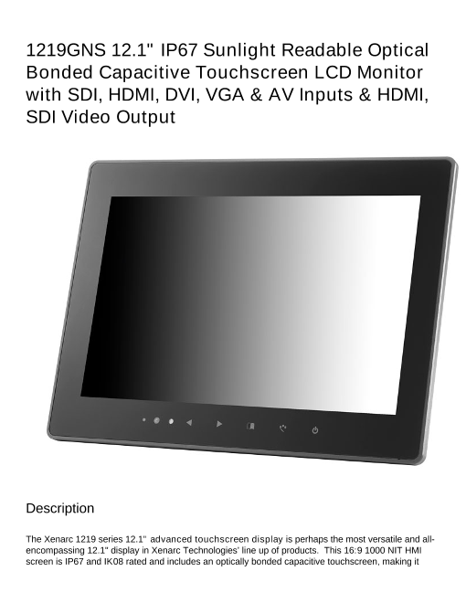 12.1インチワイド投影静電式マルチタッチパネル液晶モニター(16:9) SDI入出力、HDMI入出力、DVI入力、VGA入力、ビデオ入力 x 2、全面防塵防水IP67、太陽光下で見える高輝度タイプ (1219GNS 12.1" IP67 Sunlig...
