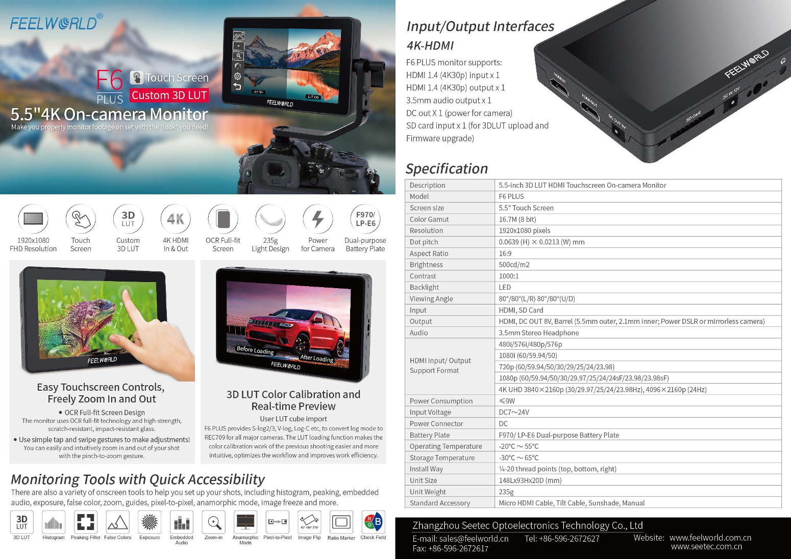 5.5インチワイド液晶モニタ、16:9、HDMI入出力、4K 表示、輝度500cd/...