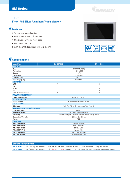 10.1インチ 液晶モニタ、IP65 前面防塵防水, 5線抵抗式タッチパネル 仕様 ・画面サイズ:10.1インチTFT (4:3) ・物理画素:1280 x 800 ・LCDパネル輝度:500 cd/m2 ・コントラスト比:800:1 ・視...