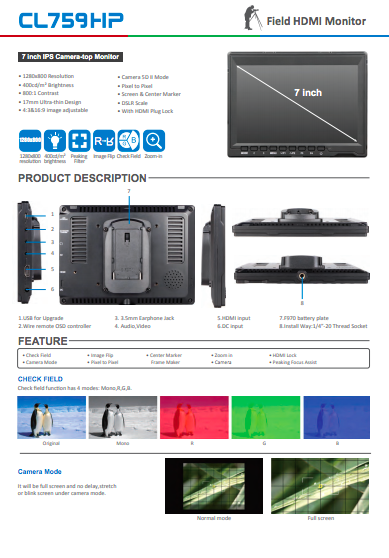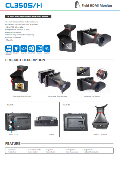 3.5インチワイド液晶16:9 HD-SDI入出力x1+HDMI入力x1、高解像度 1080i/p、電子ビューファインダー(CL350S) 3.5インチワイド液晶16:9 HDMI入出力x1、高解像度 1080i/p、電子ビューファインダー(CL350...