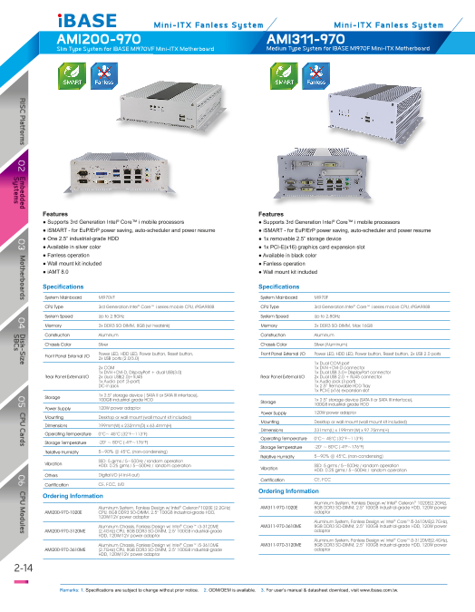 特長 ■幅199×高さ63.4×奥行232mm 2.92リットル ■第3世代 ソケットrPGA988B Core i シリーズ mobile CPU (最大2.8GHz) ■ファンレス動作 ■DDR3 SO-DIMM 最大8GB ■動作温度 0...