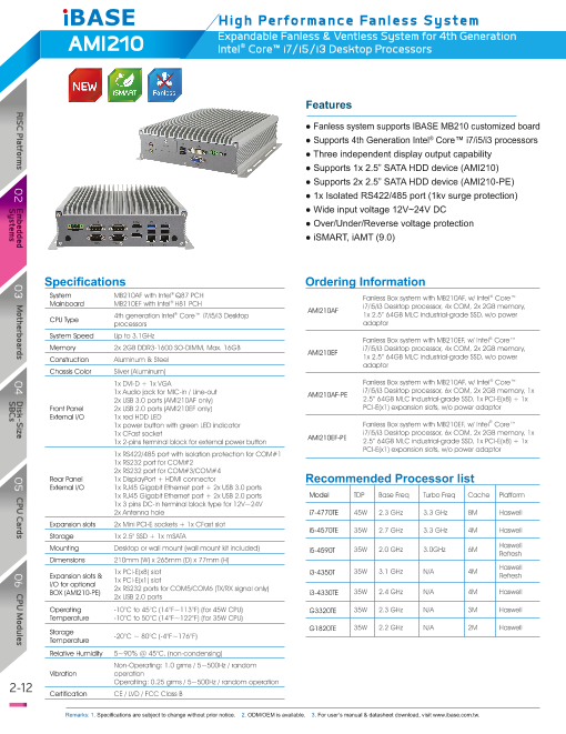 特長 ■幅210×高さ71.6×奥行265mm(AM210) 3.98リットル ■幅210×高さ128.6×奥行265mm(AM210-PE) 7.15リットル ■第4世代Core i Desktop CPU ■ファンレス動作 ■DDR3 SO...