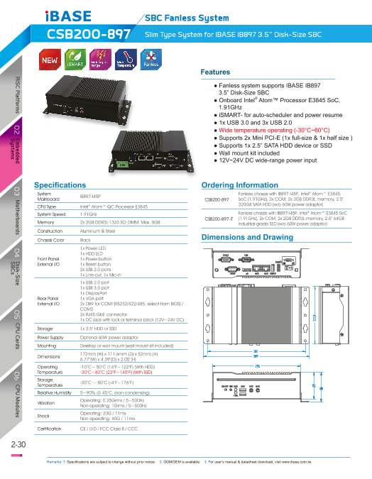 特長 ■幅172×高さ52×奥行111.6mm 1.00リットル ■低消費電力 Atom E3845 1.91GHz CPU ■ファンレス動作 ■1リットルコンパクトサイズ ■拡張温度対応 -30~60℃ ■iSMART auto-sched...