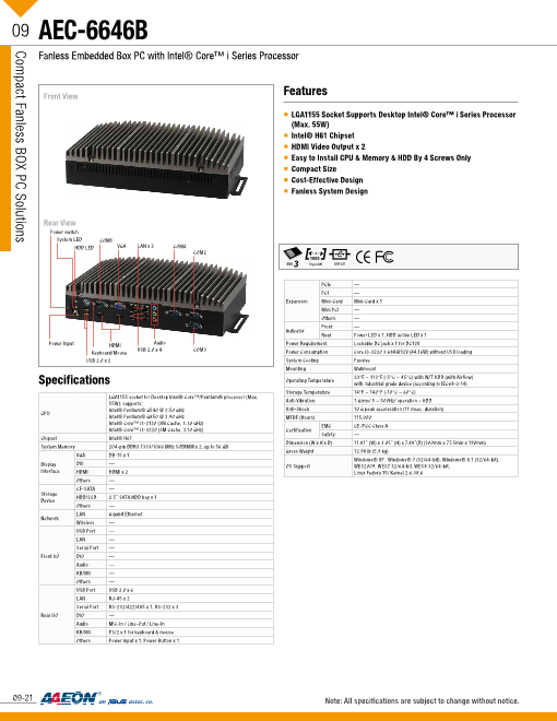 特長 ■幅300×高さ75.5×奥行190mm 4.30リットル ■Core Desktop LGA1155ソケット CPU ファンレス ■4 COM /6 USB2.0 /2 GbE ■VGA, 2 HDMI サポート(AEC-6646 Rev...