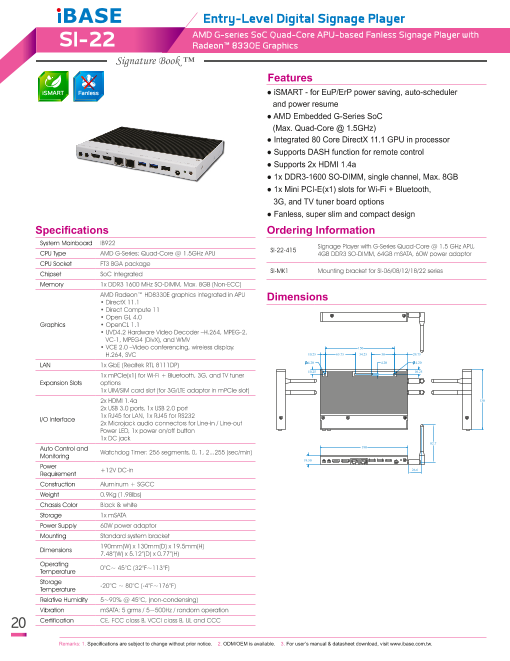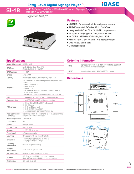 特長 ■幅190×高さ19.5×奥行130mm 0.49リットル ■AMD Gシリーズ 4Core APU SoC 1.5GHz CPU ■Integrated 80 Core DirectX 11 GPU in CPU ■ファンレス動作、超薄型...