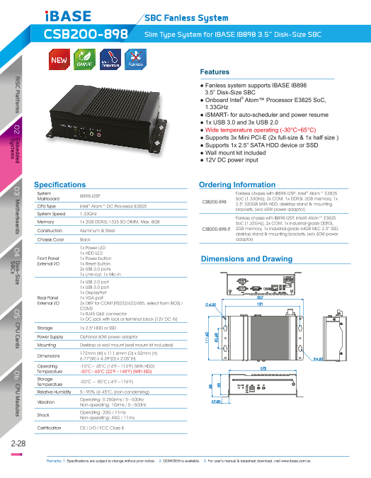 特長 ■幅172×高さ52×奥行111.6mm 1.00リットル ■Atom E3825 DC 1.33GHz CPU ■ファンレス動作 ■1リットルコンパクトサイズ ■拡張温度対応 -30~65℃(SSD) ■Mini PCI-E x 3(...