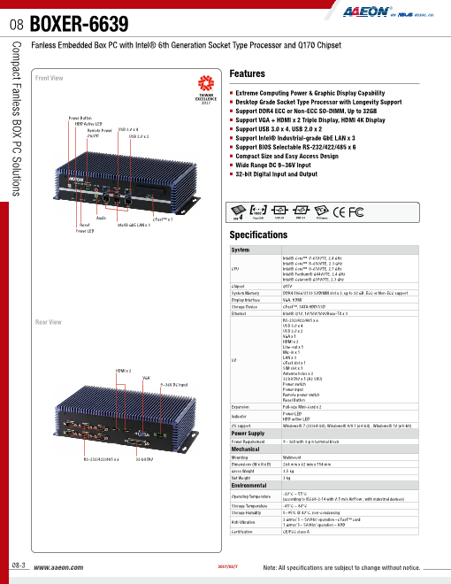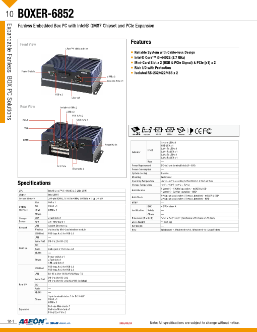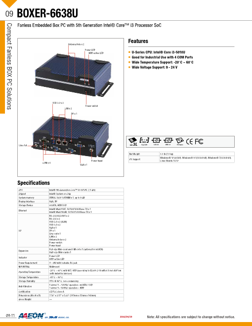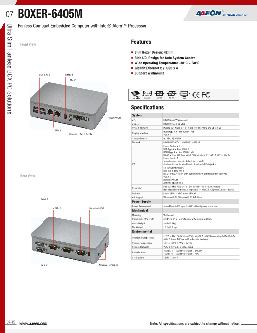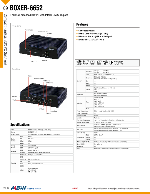 特長 ■幅264.16×高さ193.5×奥行109.3mm 5.58リットル ■Core i5-4402E CPU ファンレス ■6 COM / 2 USB3.0 / 4 USB2.0 / 2 GigaLAN ■CFast / 2.5"HDD ...