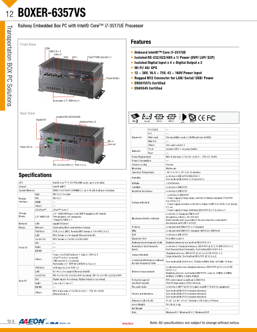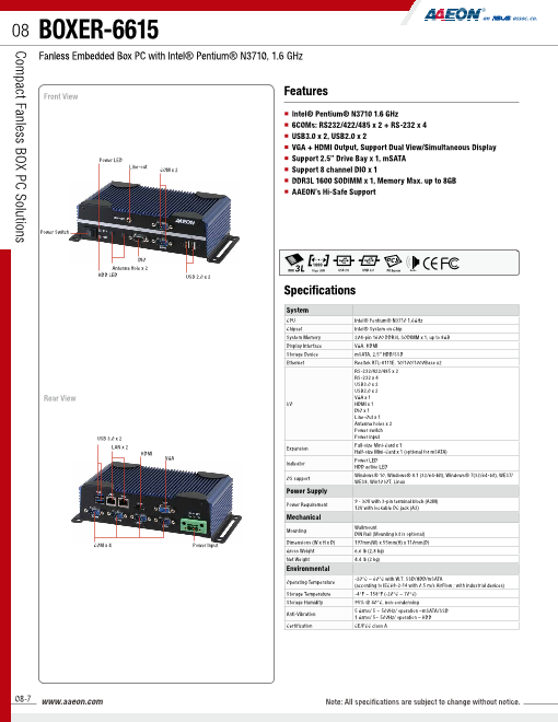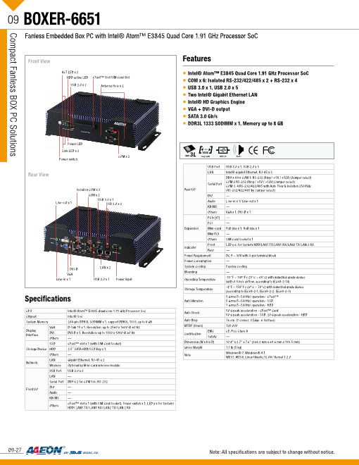特長 ■幅264.2×高さ69.6×奥行193.5mm 3.55リットル ■Atom E3845 CPU ファンレス / SoC ■6 COM / 1 USB3.0 / 5 USB2.0 / 2 GigaLAN ■CFast / 2.5"HDD ...