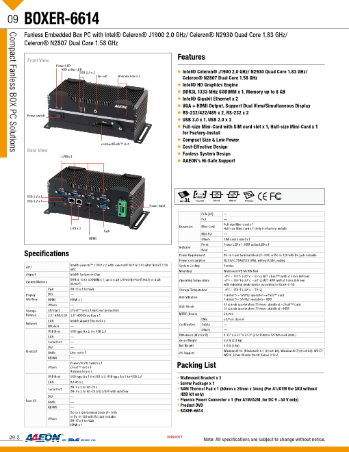 特長 ■幅197×高さ55×奥行143mm 1.55リットル ■Core i3-5010U CPU ファンレス ■4 COM / 2 USB3.0 / 2 USB2.0(A2M) / 2 GigaLAN ■mSATA / 2.5"HDD ■ワイ...