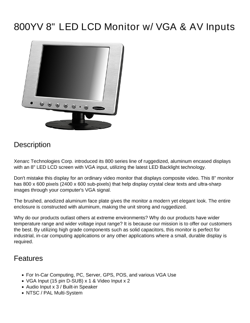 8インチ液晶モニター(4:3) VGA入力、ビデオ入力 x 2 (800YV 8" LED LCD Monitor w/ VGA & AV Inputs)