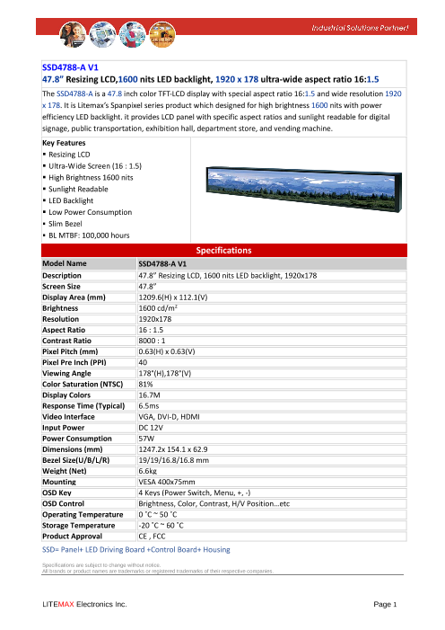 特長 ■47.8" リサイズTFT LCD ウルトラワイドスクリーン (16:1.5) ■太陽光の下でも見える超高輝度(1600nits)液晶パネル採用 ■超寿命LEDバックライト採用(100,000時間) ■低消費電力(57W) ■高均一性 ...