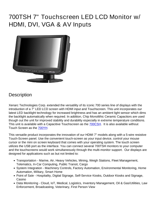 7インチワイドタッチパネル液晶モニター(16:9) HDMI入力、DVI入力、VGA入力、ビデオ入力 x 2 (700TSH 7" Touchscreen LED LCD Monitor w/ HDMI, DVI, VGA & AV Inputs)