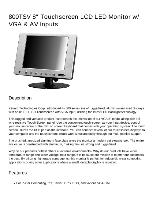 8インチタッチパネル液晶モニター(4:3) VGA入力、ビデオ入力 x 2 (800TSV 8" Touchscreen LCD LED Monitor w/ VGA & AV Inputs)