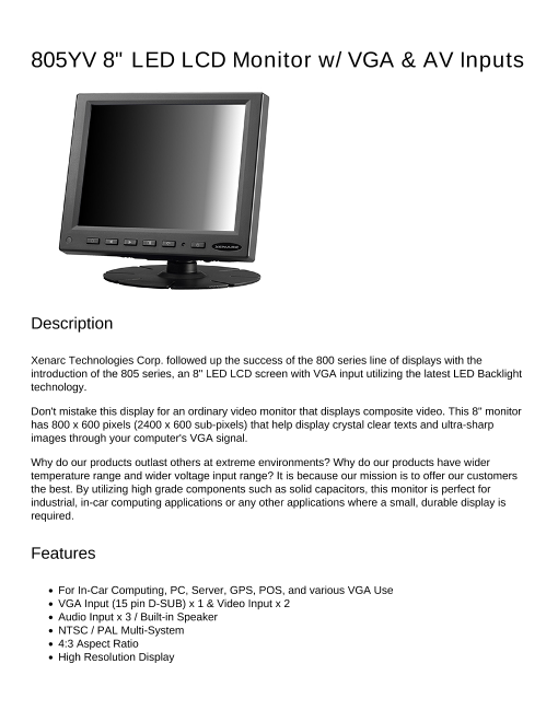8インチ液晶モニター(4:3) VGA入力、ビデオ入力 x 2 (805YV 8" LED LCD Monitor w/ VGA & AV Inputs)
