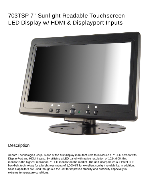 7インチワイドタッチパネル液晶モニター(16:9) HDMI入力、DP入力、太陽光の下でも見える高輝度タイプ (703TSP 7" Sunlight Readable Touchscreen LED Display w/ HDMI & Displayp...