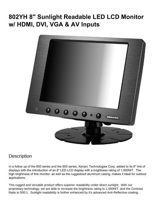 8インチ液晶モニター(4:3) HDMI入力、DVI入力、VGA入力、ビデオ入力 x 2、太陽光の下でも見える高輝度タイプ (802YH 8" Sunlight Readable LED LCD Monitor w/ HDMI, DVI, VGA & ...